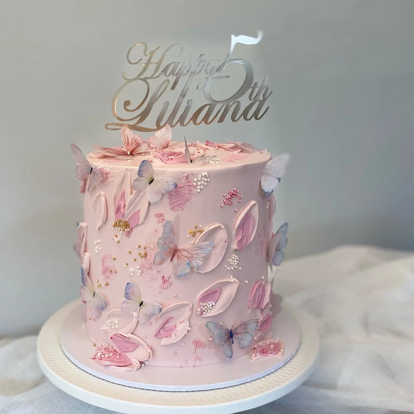 Delicate shades of pastel pink bring elegance to this tall birthday cake, beautifully decorated with lifelike butterflies. Textured frosting strokes paired with tiny pearl sprinkles add dimension, creating a graceful backdrop for the “Happy 5th” topper that completes the design.